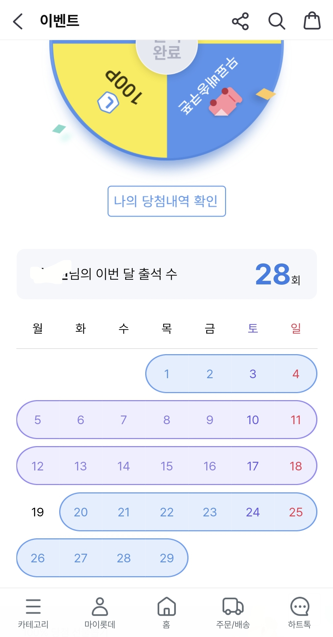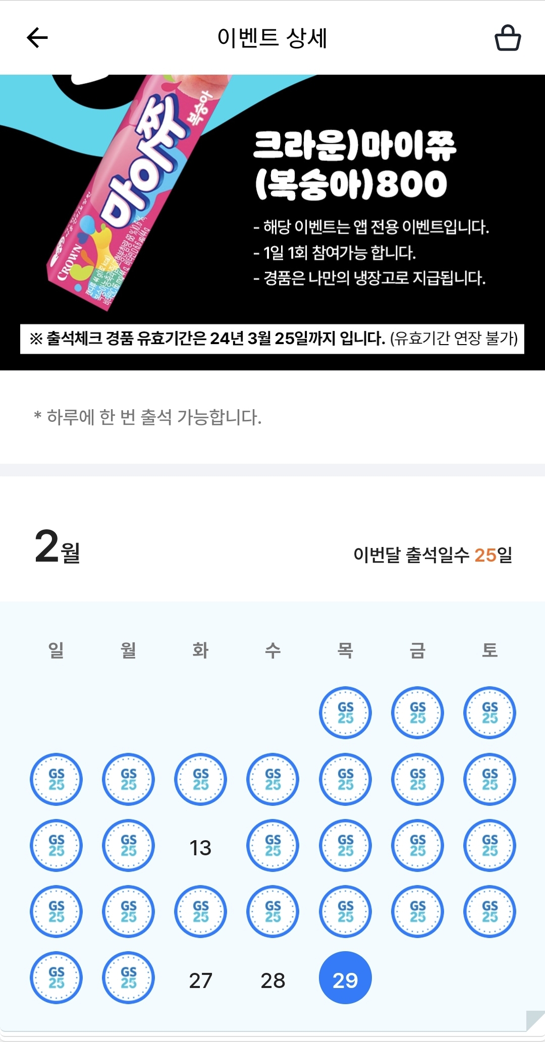 다른 출석체크 앱테크는 1일부터 말일까지 만근을 해야 하지만 GS25 나만의 냉장고는 이름답게 25일만 출석체크 하면 돼요