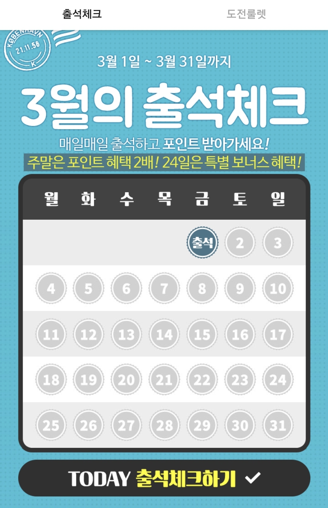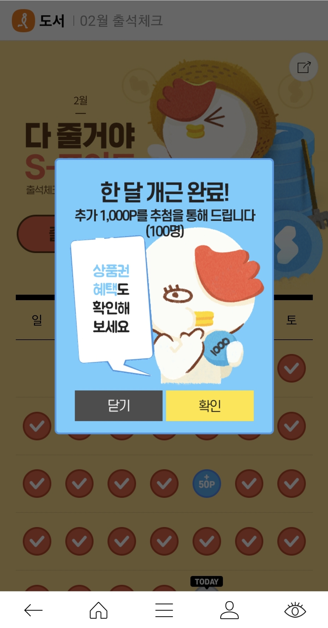 이것도 만근 하면 모바일 문화상품권 1천원 받을 수 있는데 2월은 만근을 못했어요..