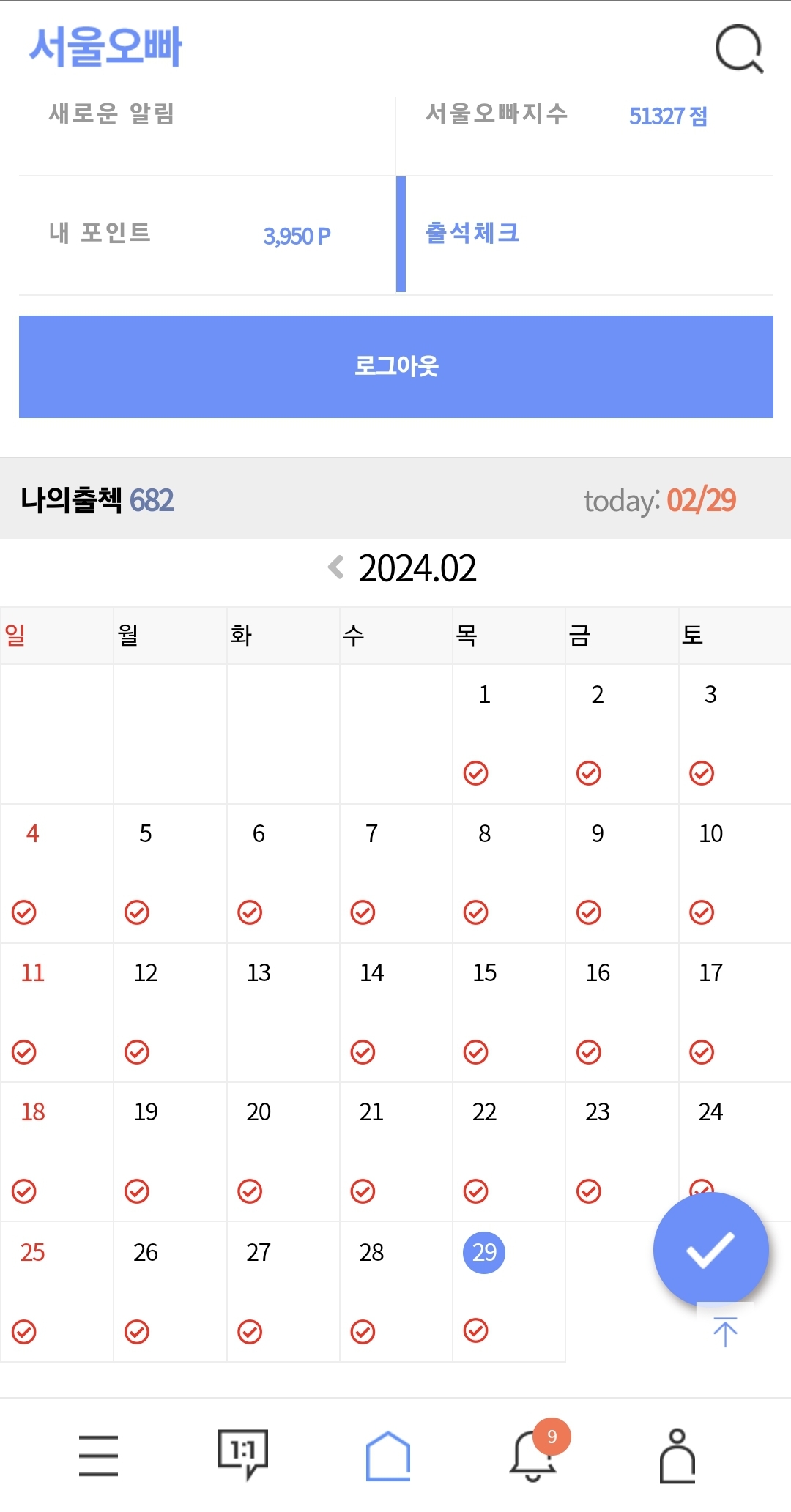 서울오빠는 블로그 체험단 때문에 가입했는데 출석체크 있어서 계속하고 있어요