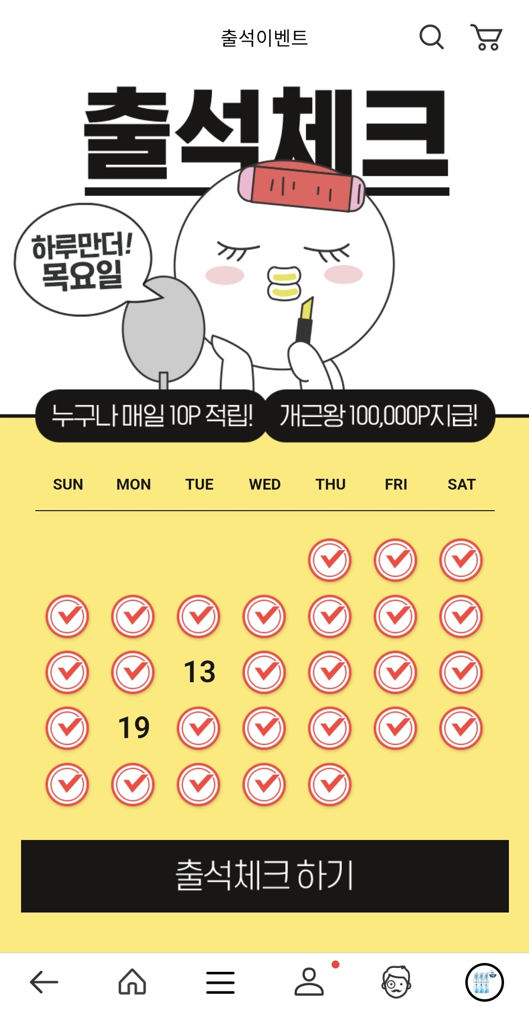 예스24NEB 에서 출석체크와 도전룰렛, 오후 2~4시에 10P 받을 수 있고, YES24도서 앱에서도 랜덤으로 포인트 또는 쿠폰을 받을 수 있어요