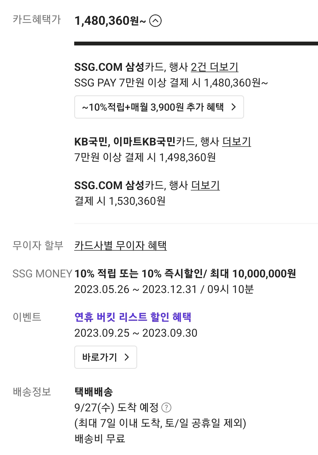 최저가 4위 사이트 ) SSG닷컴 1,498,360원 무이자할부, 카드할인, 쿠폰할인