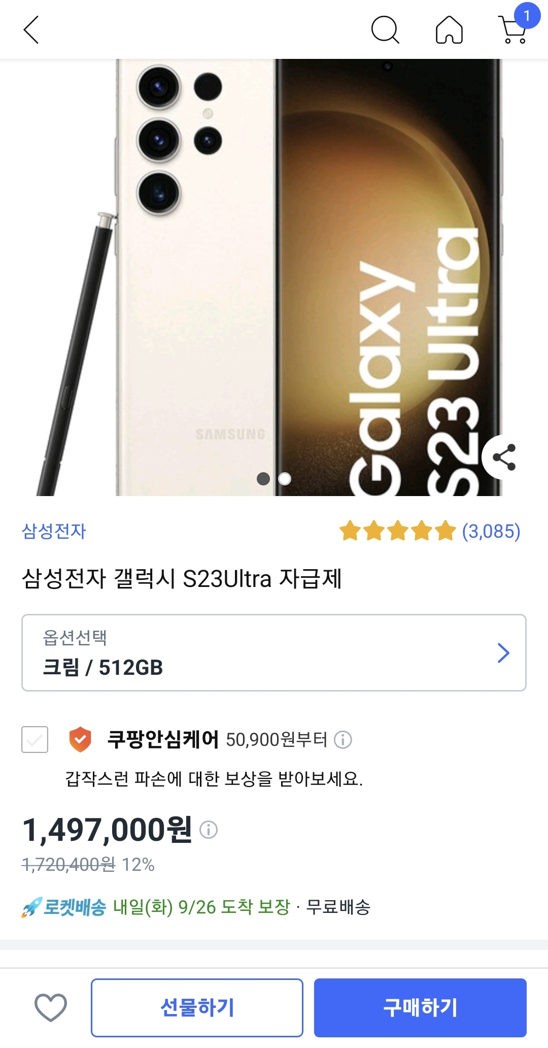 쿠팡에서 Galaxy S23Ultra 512GB 를 1,497,000원에 무이자할부 최대 22개월까지 구매할 수 있어요
