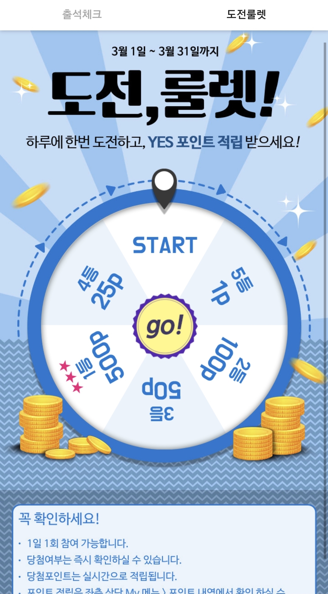 예스24NEB 에서 출석체크와 도전룰렛, 오후 2~4시에 10P 받을 수 있고, YES24도서 앱에서도 랜덤으로 포인트 또는 쿠폰을 받을 수 있어요