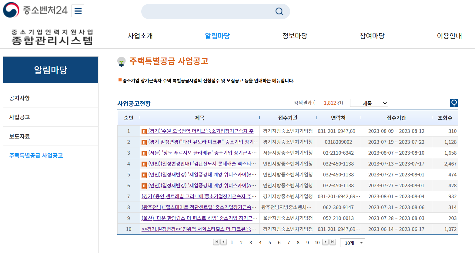 중소벤처24 사이트에서 주택특별공급 사업공고문을 확인하실 수 있어요