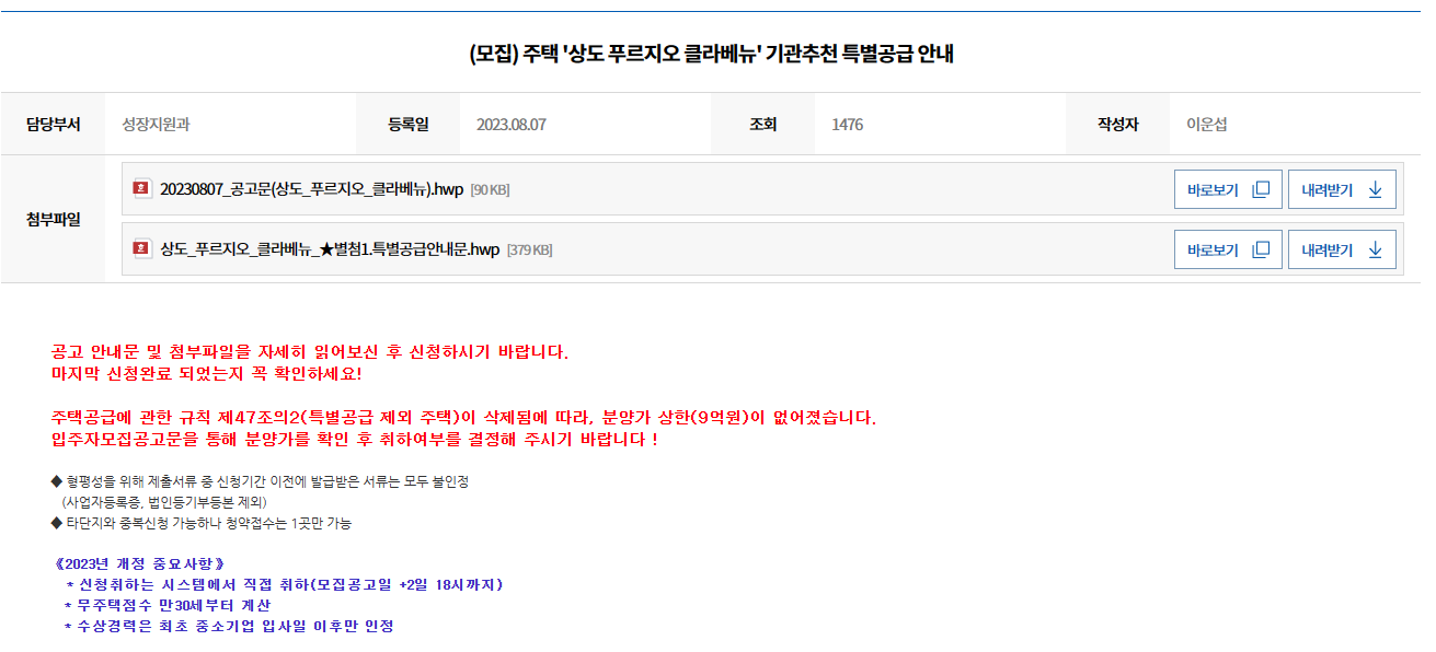 청약홈에서 이미 아파트 청약 모집 공고문이 나왔다면 기관추천 특별공급은 이미 끝난 뒤입니다